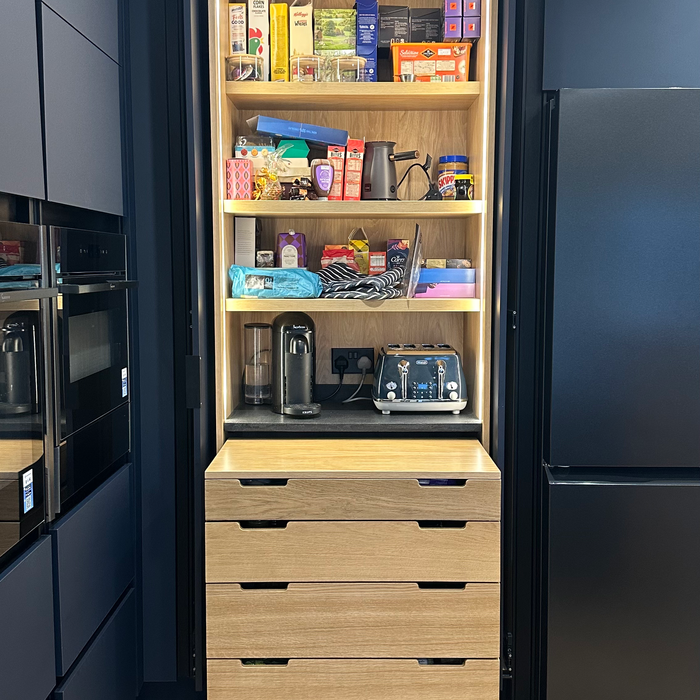 A dedicated breakfast station cabinet houses the toaster and kettle, ensuring a clutter-free countertop. Built-in ovens and various drawer customisations enhance convenience. The utility unit, incorporating the washer and dryer, includes ample storage solutions with hidden pipes and wiring, maintaining the streamlined design. Perfect for those who appreciate clean lines and organised spaces, this kitchen combines form and function beautifully.