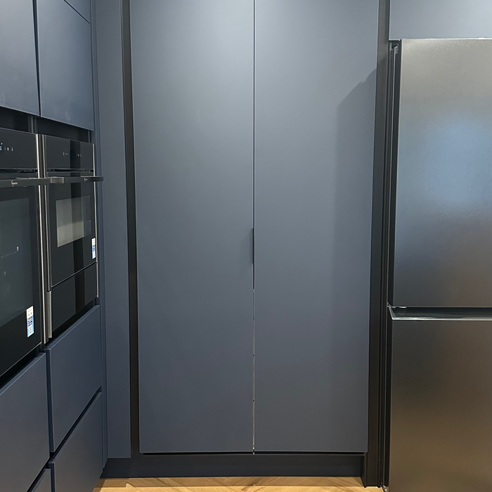 This sleek kitchen was designed with modern efficiency and functionality in mind without sacrificing aesthetics. The dark blue cabinetry with black appliances creates a sophisticated atmosphere, featuring handle-less cabinets for a clean, uninterrupted look. The breakfast island includes an extendable countertop and integrated bins for seamless organisation.